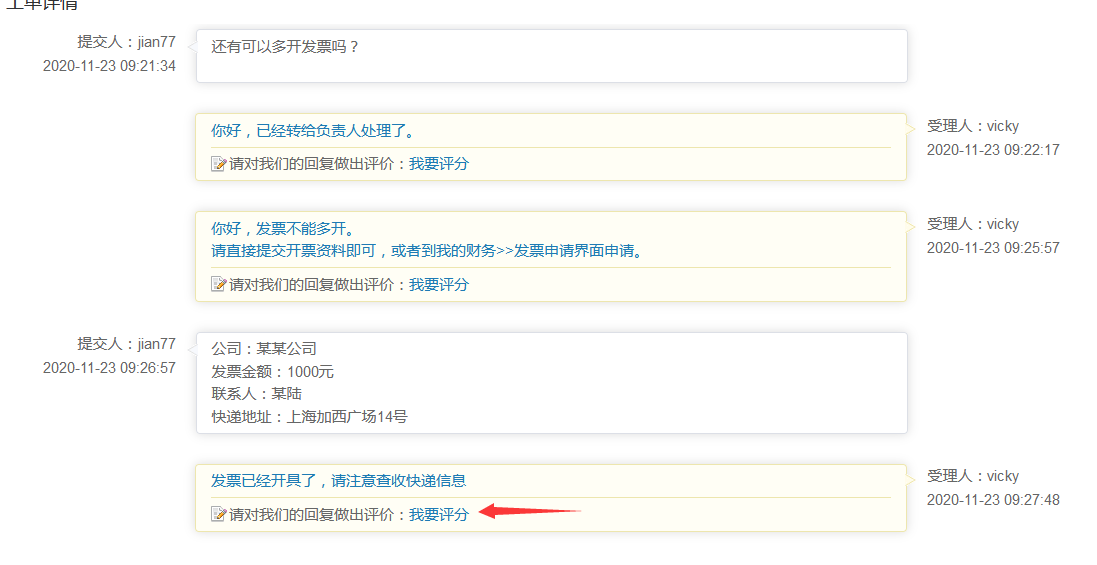 4、支持用户评分,评价,为售后绩效考核提供数据。